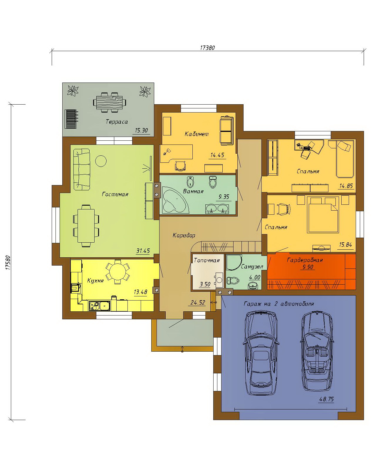 Антверпен - все помещения в данном проекте расположены в одном уровне, что позволяет без помех перемещаться между помещениями. В проекте есть все необходимое для комфортного проживания. Хозяйская спальня имеет отдельную гардеробную и ванную . Просторного гаража хватает для размещения двух автомобилей.