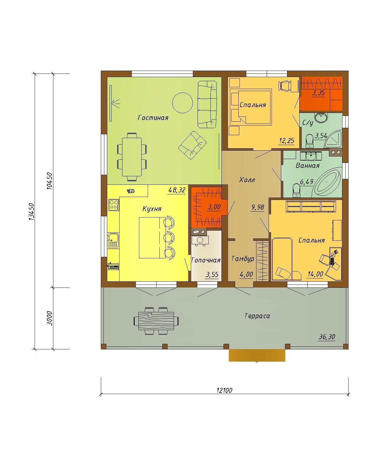 Проект дома «Дюнкерк» - является компактным домом с двумя спальнями и просторной террасой на всю ширину дома. Хозяйская спальня имеет собственную ванную комнату и гардеробную. Выход на террасу осуществляется из кухни и детской спальни.