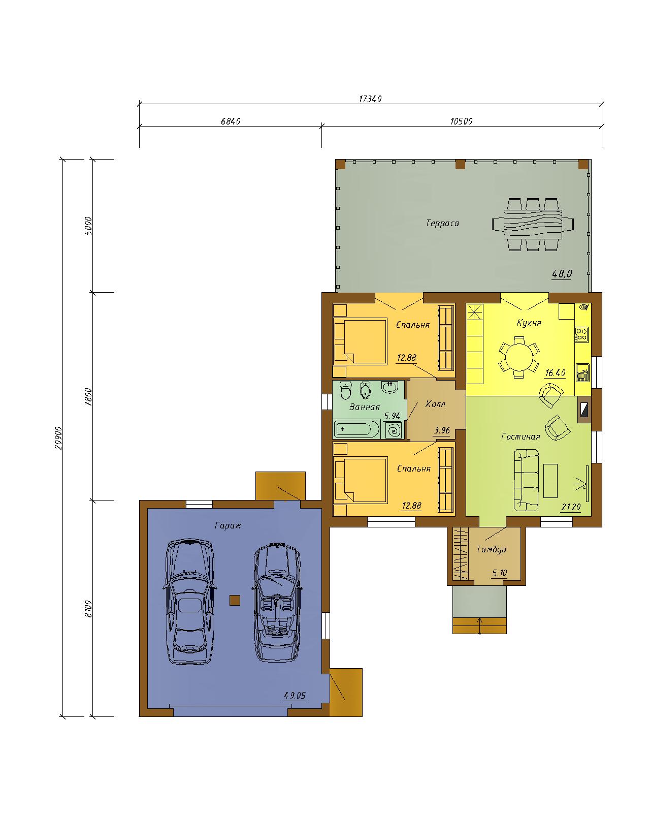 Готовый проект одноэтажного дома с террасой и гаражом на два автомобиля.
