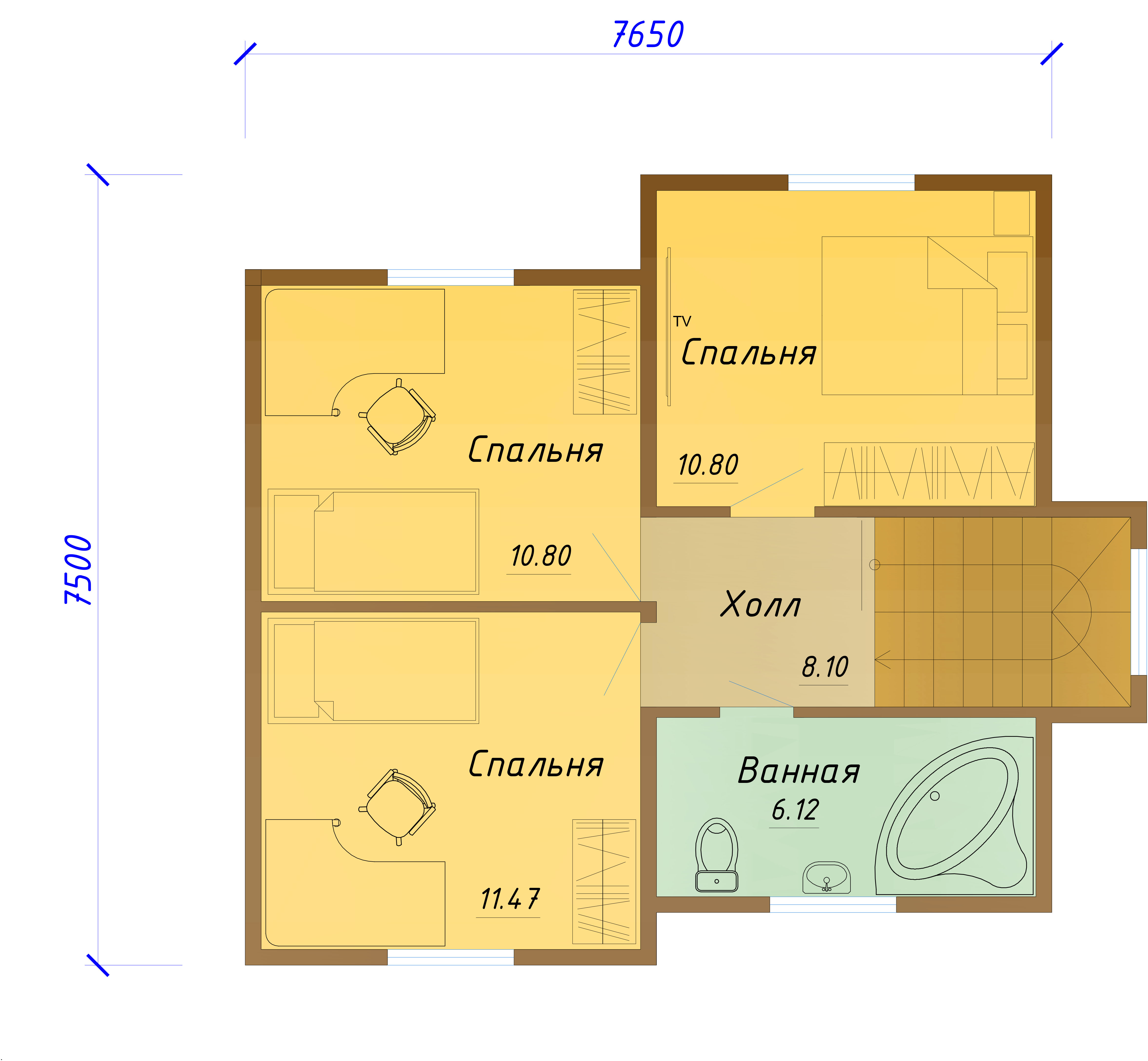 Проект мансардного дома «Хельсинки» является отличным примером компактного дома с интересной планировкой. Первый этаж – гостевой. Там разместились ванная, холл, гостиная и кухня с выходом на террасу. Второй этаж – жилой, с тремя спальнями и ванной комнатой.