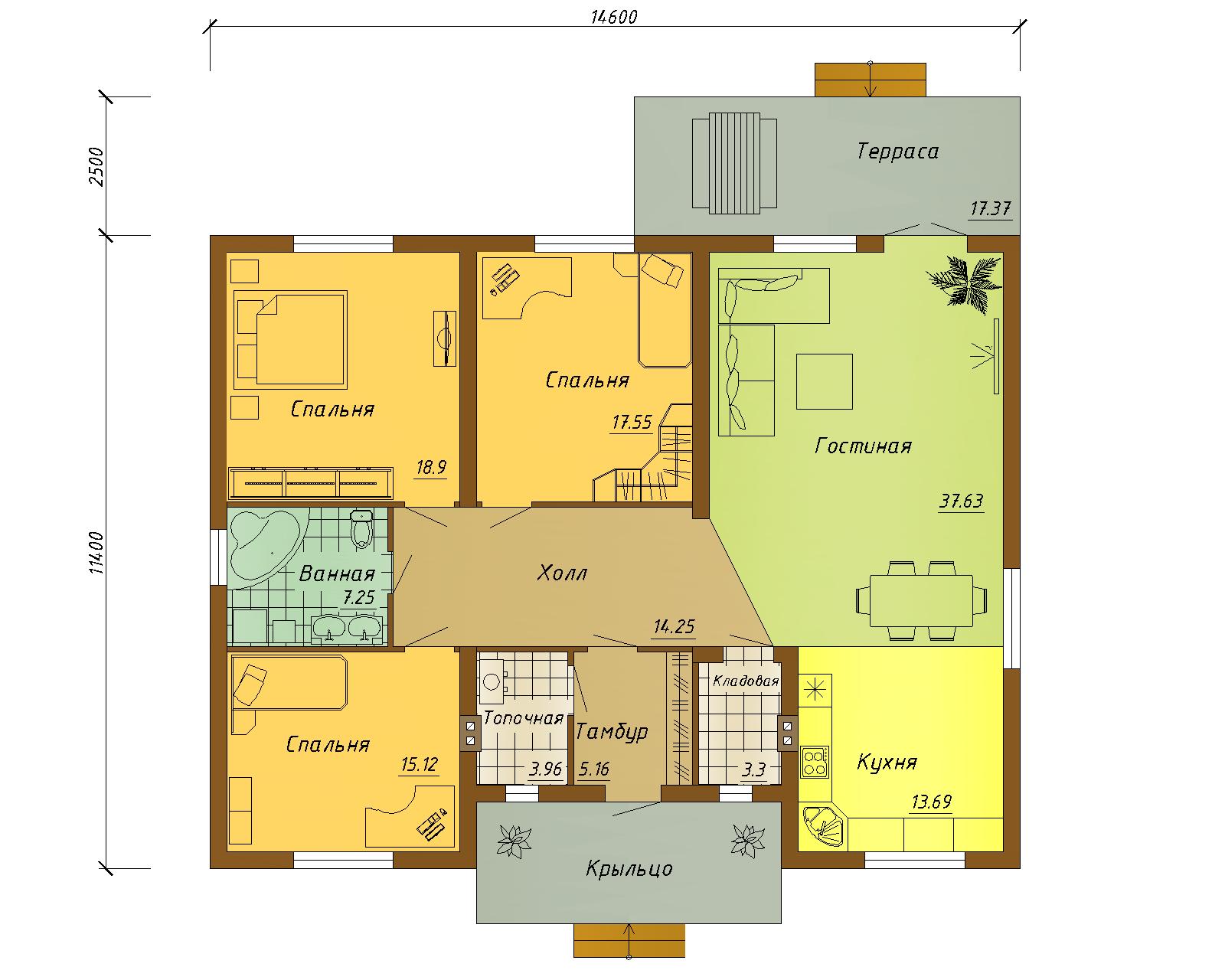Готовый проект одноэтажного дома с террасой.