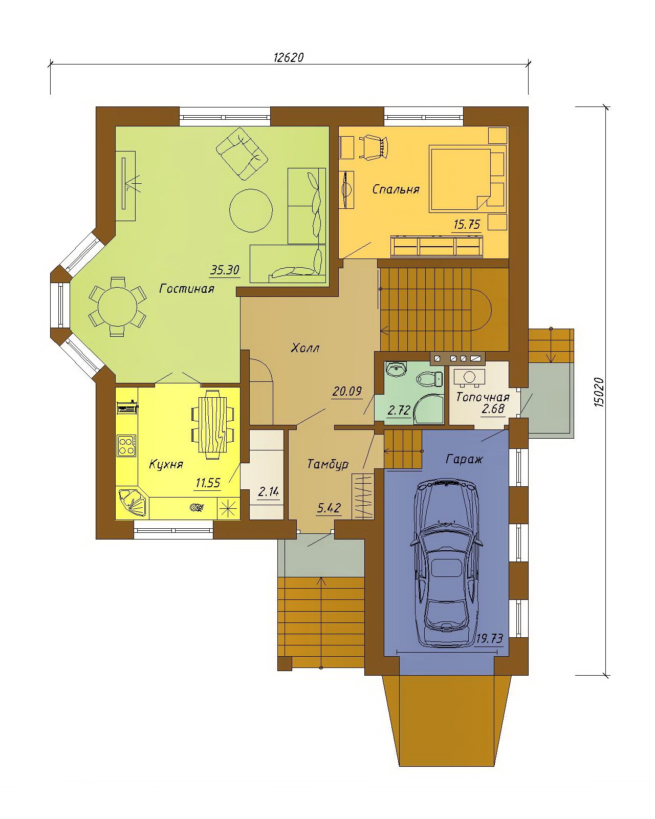 Готовый проект одноэтажного дома с гаражом на один автомобиль.