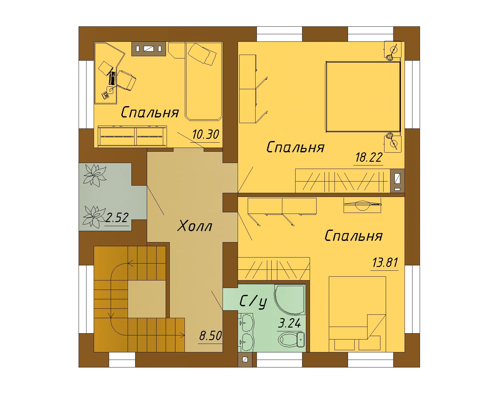 Манхэттен - проект компактного мансардного жилого дома с многоскатной крышей. На первом этаже дома размещаются гостиная, кухня, ванная и топочная. На втором – три спальни , санузел, а также балкон. Топочная расположена смежно с ванной комнатой, однако вход в топочную осуществляется с крыльца дома. Сложная крыша и необычная форма окон делают облик дома неповторимым.