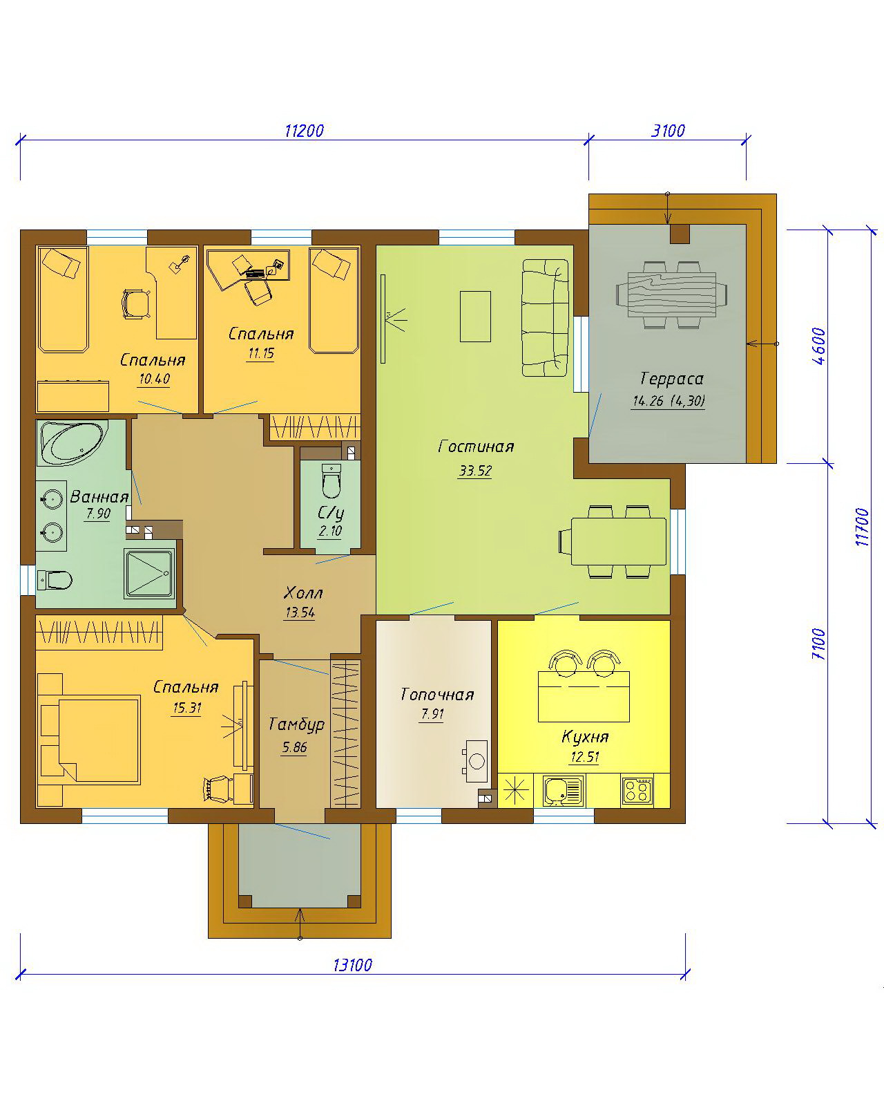 Проект дома «Монако» - представляет собой одноэтажный жилой дом с тремя спальнями. Рядом с кухней располагается просторная топочная, часть которой можно оснастить стеллажами и использовать для хранения. На крытой террасе будет комфортно проводить время в любую погоду.