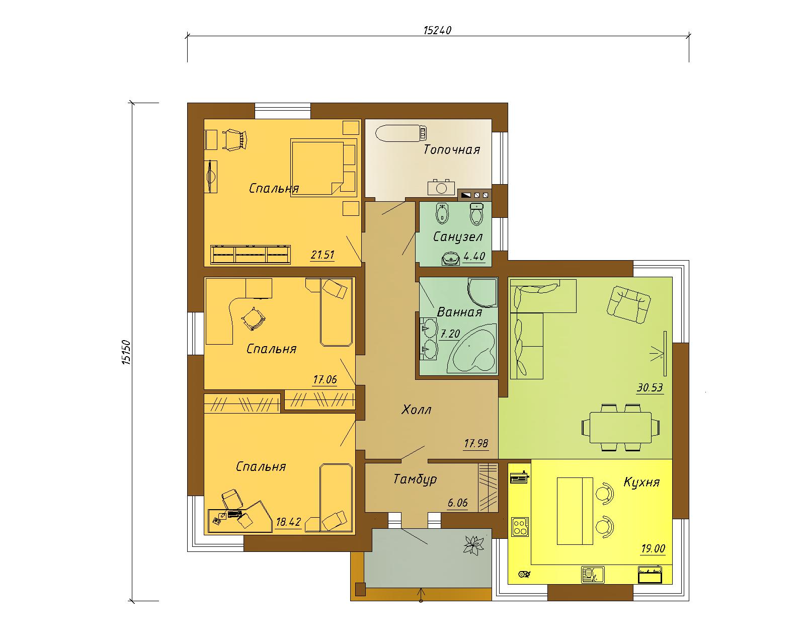 Готовый проект одноэтажного дома с тремя спальными комнатами.
