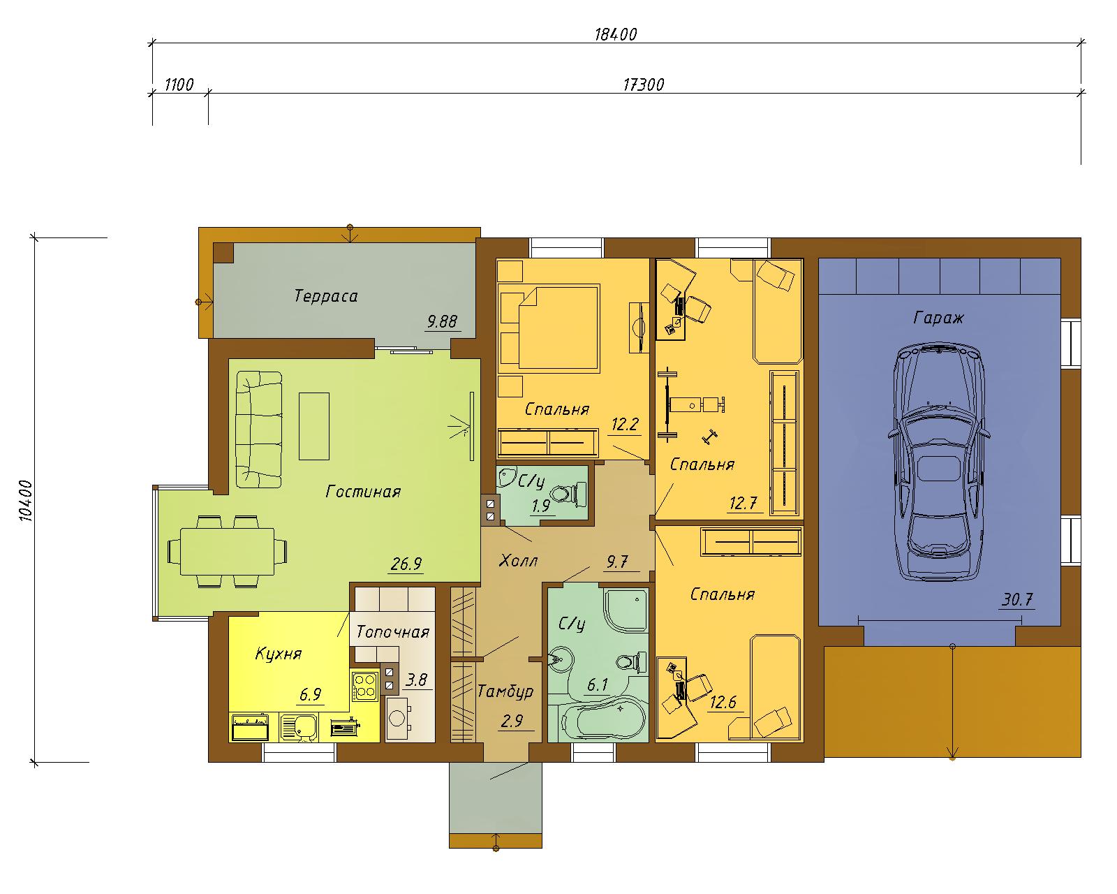 Готовый проект одноэтажного дома с террасой и гаражом на один автомобиль.