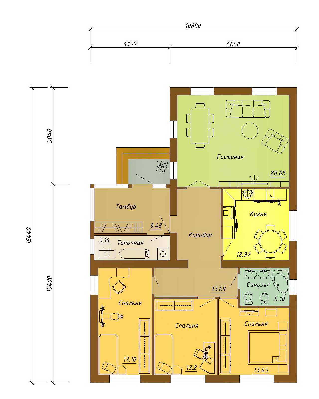 Готовый проект одноэтажного дома с тремя спальными комнатами.