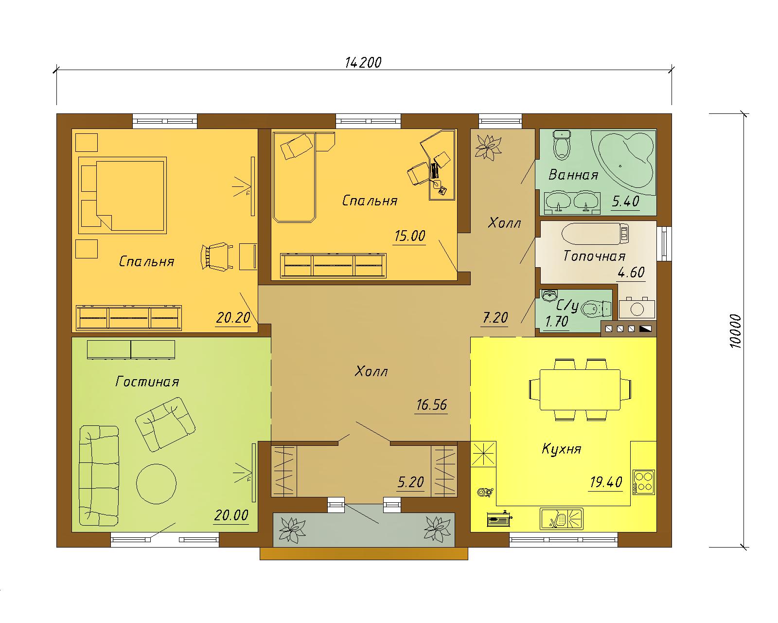 Толедо – проект одноэтажного дома с многоскатной кровлей и большими панорамными окнами. Внешний традиционный стиль в экстерьере, прекрасно сочетается с практичной планировкой. Отсутствие большого числа перегородок визуально расширяет пространство. Панорамные окна в гостиной и кухне дают большое количество света.