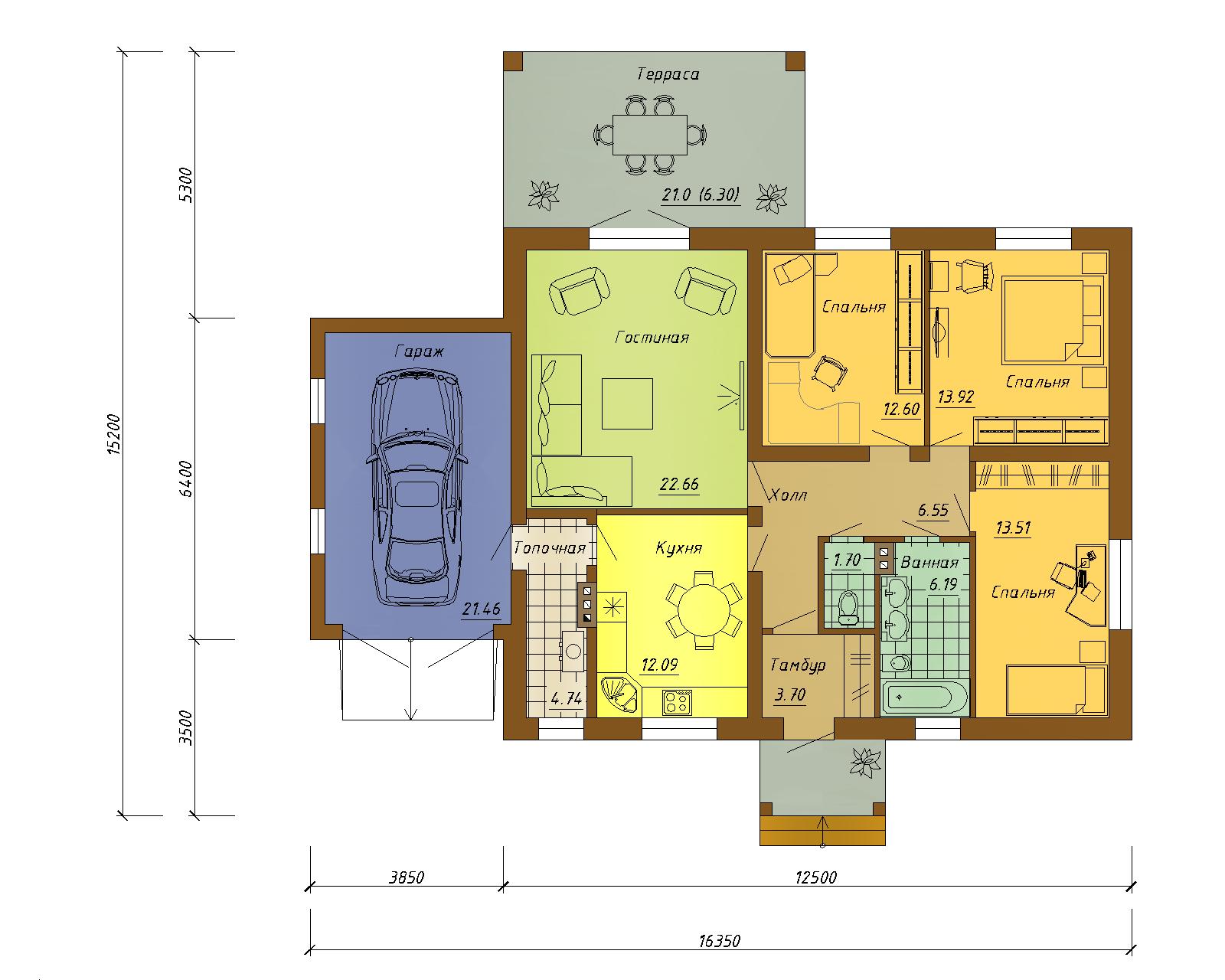 Тулуза - проект одноэтажного жилого дома с пристроенным гаражом.. К кухне примыкает топочная, что дает возможность использовать свободное пространство для хранения кухонного инвентаря. Большие панорамные двери ведущие на террасу наполняют гостиную светом.